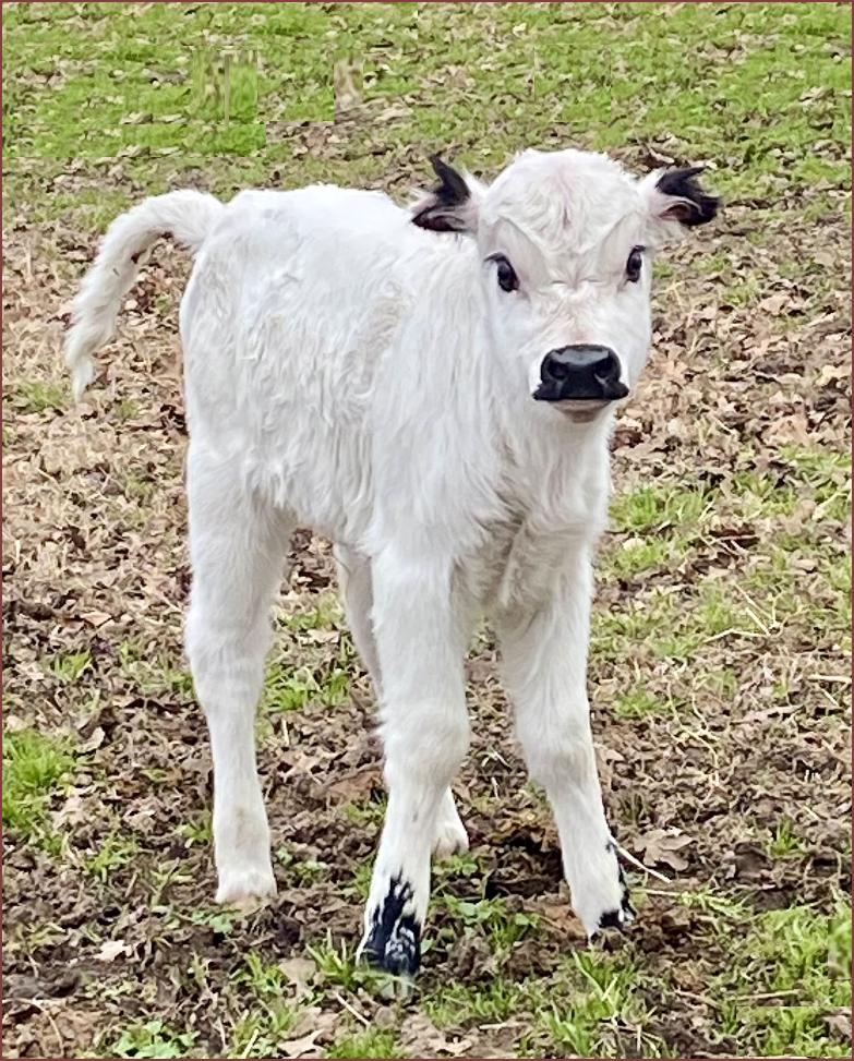 Rat Tail Calf w/ Dun Dilution (SILV) - Simmental. (Pmel17) gene. Incompletely dominant. Sources vary whether or not this dilute mutation of coat color dilution is different than the Charolais Dc dilution. Heterozygotes show moderate dilution of black to grey, and homozygotes are a lighter grey. The Ds dilution mutation does not express as obviously in red cattle. This dilute mutation can be epistatically affected by a HY mutation, and be associated with a rat tail calf, which is an undesirable, less hardy calf. (Simmental, Hereford, Gelbvieh; maybe Charolais)